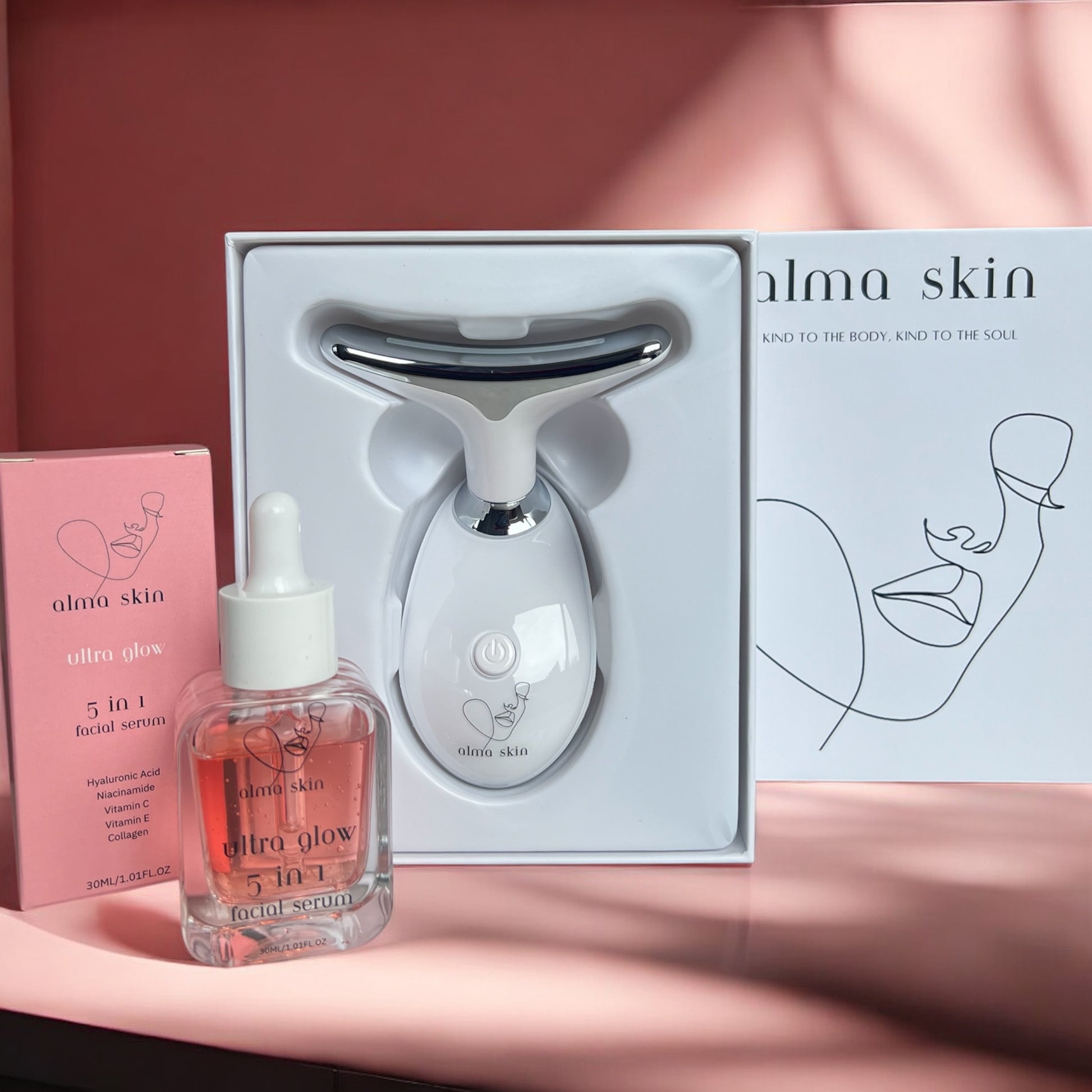 Experience the ultimate in skincare innovation with the Alma Skin Ultra Glow 5-in-1 Facial Serum. Whether used solo or with the Face Sculpting Device, it’s your go-to solution for smoother, brighter, and healthier-looking skin.